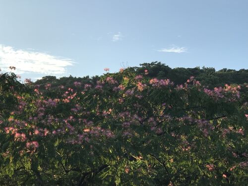 樹冠と目線がほぼ同じになるような斜面が。夕日を浴びて赤く。200731 18:36おわり